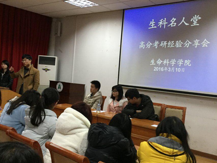 3月10日晚,“生科名人堂”活动在生科院二号报告厅举行,此次活动邀请了在15年考研中取得优秀成绩的杨永富、张华豹、龚紫云、张光雨、刘源彬、杨静六位优秀同学座谈,他们用自己考研的亲身经历鼓励着即将面对考研的学弟学妹们,同时也分享了自己的学习经验。