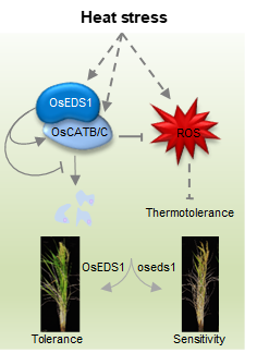 图3.OsEDS1通过与OsCATB/C互作清除活性氧调控水稻耐高温示意图。