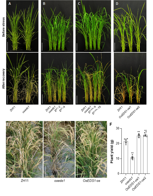 图2.OsEDS1正调控水稻对高温的耐受性。