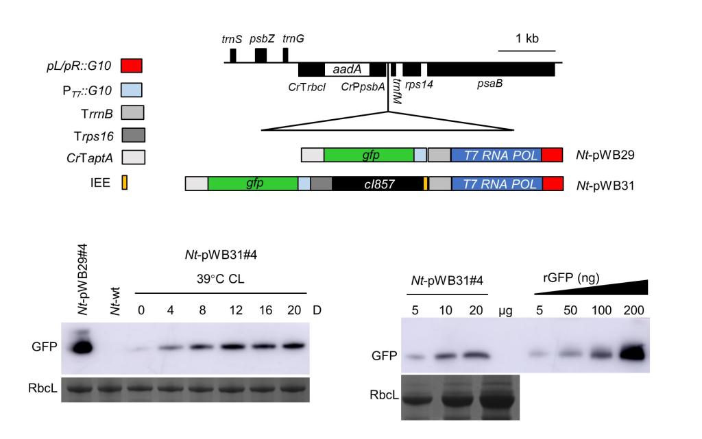 该系统基于λ噬菌体向左和向右启动子(pL/pR)及其温度敏感阻遏物cI857,研究首先通过质体转化的方法在烟草质体中构建了热诱导表达系统。并测试了这一系统的有效性。研究发现,在正常生长条件下,cI857可以有效抑制质体中绿色荧光蛋白(GFP)的表达,并在光依赖过程中暴露于高温时随着时间的推移而被诱导。然而,这一热诱导系统的表达潜力较低,GFP的积累量仅为植物总可溶蛋白(TSP)的0.02%左右。为了提高系统的表达潜力,作者进一步将源于T7噬菌体的T7 RNA聚合酶及其识别的T7启动子等元件引入到这一热诱导系统中,构建了一种偶联RNA扩增的热诱导系统(heat induction coupled RNA amplification system,HICoRA)。在含有HICoRA系统的转基因烟草Nt-pWB3热诱导处理时,阻遏物cI857对启动子pL/pR的抑制会首先解除,下游的T7 RNA聚合酶将被诱导表达,而后T7 RNA聚合酶将会启动T7启动子控制的GFP的转录,最终使GFP大量积累,达到TSP的0.48%左右。本研究为将来应用植物质体作为生物反应器以及质体合成生物学研究奠定了基础。