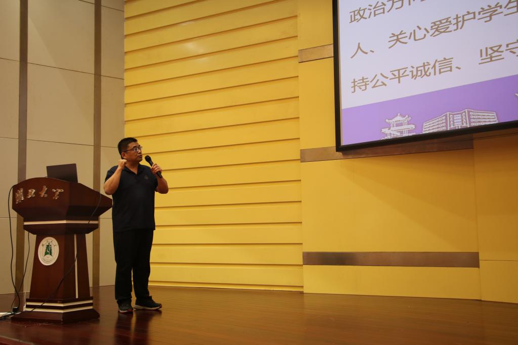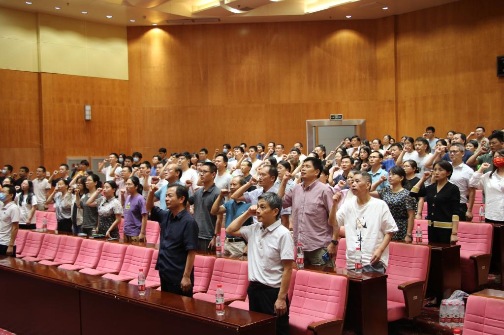 为扎实推进师德师风建设工作,立足建设和完善师德师风长效机制,学院还开展了教师宣誓活动。“湖北名师工作室”主持人张海谋教授带领全体教职工庄严宣誓。铿锵有力的誓言宣告着学院教职工为党育人、为国育才的决心,宣示着学院高质量发展、再建新功的信心。