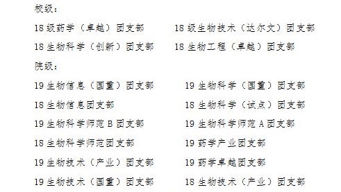 (通讯员:李雨骁)3月31日晚6点30分,生科院二报举行了生科院各班红旗团支部的评选,院党委副书记许良发,院团委书记刘阳卓,及各班班主任出席该活动,最终评选18级药学(卓越)等4个团支部为校级“红旗团支部”,19级生物信息(国重)等12个团支部为院级团支部,具体名单公示如下。