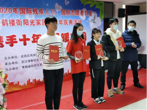 据了解,此次活动由武汉博雅社会工作服务中心、区残疾人联合会、黄鹤楼街阳光花园等单位共同举办。庆典上,大家纷纷展示精彩的节目向阳光花园表达真挚的祝福。有一位伯伯用笛声表达祝福,余音缭绕,云起雪飞,勾起了大家对过去的怀念。在过去的时光里,志愿者们同大家一起前进,用心汇聚温暖,用爱填补空白,携手十年,爱暖家园。他们的无私奉献也得到了阳光花园居民的认可和赞同,并且收到了来自武昌区黄鹤楼街残疾人联合会的的荣誉证书,这可以说是对志愿者们这几年来的工作最大的肯定。在他们的荣誉证书里写到“为感谢贵团队对阳光花园的爱心付出和大力支持,特颁发‘优秀志愿服务团队’荣誉证书”。有人说给予是一种幸运,它给人温馨与喜悦;有人说收获是一种幸福,它让你体会满足与激动。志愿者们用金子般的爱心收获纯洁的欢笑与真诚,感受彼此心灵的贴近。据愈合花园服务队青年志愿者代表冯东升介绍,愈合花园志愿服务项目已经正式立项,之后会有组织、有蓝图、有行动地为大家服务。