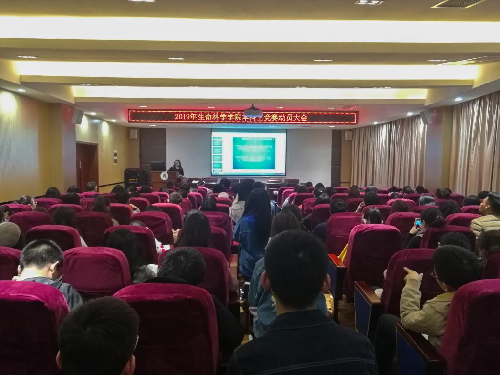 大会首先由教授何玉池为大家讲解2019年即将开始的几项大赛,分别是:第四届全国大学生生命科学创新创业大赛,湖北省第六届大学生生物实验技能竞赛,第三届全国大学生生命科学竞赛和中国细胞生物学会“创意课堂”大赛。“我认为这些竞赛最有获奖希望的就是创新创业大赛,大家都可以积极准备”教授何玉池鼓励大家积极参赛,并表示大二是参赛的好时候,大三是更好的时候,而大一现在也可以开始着手进行相关准备。在教授何玉池对比赛相关事项讲解完毕后,她特别邀请了具有丰富参赛经验的两位同学来为大家分享心得。首先是来自16级生物技术产业班的吴雨薇,她向大家详细的讲解了生命科学创新创业大赛的参赛准备流程,并叮嘱大家在参赛过程中一定注意:抓紧国家政策,队伍要具备执行力和凝聚力,且市场调研的数据要真实。接着是来自15级生物科学试点班的姚壮,他在创新创业比赛中,对吴雨薇同学讲解的进行了几点补充后,向大家着重讲解了从参赛总体上需要注意的事项,并叮嘱大家认真审视参赛要求,不要轻言放弃。最后,许书记上台进行总结发言的同时,何玉池老师为在场的同学播放了历届学长学姐的优秀作品。在全场同学的热烈掌声中,本次竞赛动员大会圆满结束。