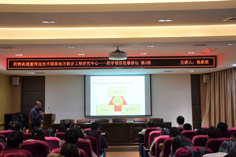 研究员杨家欣首先对自己的研究方向做了概述,包括抗癌新药研发、一些药理研究平台及他的一些研究成果。接着他说明了本次报告的研究背景,依次讲述了胰岛素血糖、血脂的调节机制,糖尿病与癌症的发病机制的影响作用,以及二甲双胍的降血糖作用机制,二甲双胍与癌症的临床试验等然后他着重介绍了姜黄素,列举了姜黄素类化合物多种生物活性的结构示意图,并详细展示了姜黄素与T2DM临床试验数据、姜黄素的分子靶点以及姜黄素的分子机制等。研究院杨家欣指出姜黄素具有良好的安全性以及调节糖脂代谢和抑制肿瘤的双重功效,但是我们仍需借助化学合成和纳米微粒技术来解决其水溶性差,代谢速度快的问题。他还利用图表分别向我们展示了MTH-3抗多种乳癌增殖作用的实验研究数据、MTH-3和姜黄素在体内抗乳腺癌活性的研究数据、MTH-3与阿霉素联合作用的研究数据、MTH-3降低细胞活力及对MDA-MB-231细胞形态的影响、自噬的分子途径以及MTH-3诱导MDA-MB-231细胞G2/M期阻滞机理等作用,后就利用次世代基因定序技术分析MTH-3与MDA-MB-231乳癌细胞相关调控基因进行介绍。在提问环节中,研究员杨家欣详细且全面地回答了在座师生提的问题。