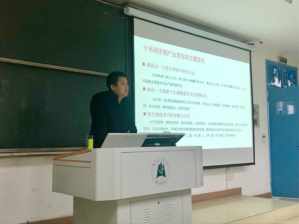 讲座的开始,伍业旭首先讲述了自己在研究生毕业后进入安琪酵母公司的学习工作经历。接着,他向同学们展示了安琪酵母公司建立的研究站和工厂自1986年在宜昌成立以来至如今的变化,并用安琪酵母股份有限公司董事长俞学锋的话解释:“安琪酵母公司的发展是中国改革开放40年的一个缩影,安琪所做的只是顺应国家发展的大趋势,在正确的时间处于正确的位置,做了正确的事情。” 继而,他向大家介绍了这些年在生物产业上发生的主要变化,并详细介绍了食品配料、益生菌和微生态制剂、生物制药、饲料添加剂、生物化工以及生物农业等方面的发展空间。最后,伍业旭鼓励学生积极探索创新,避免迷茫的状态,相信生命科学研究在不断向前发展。