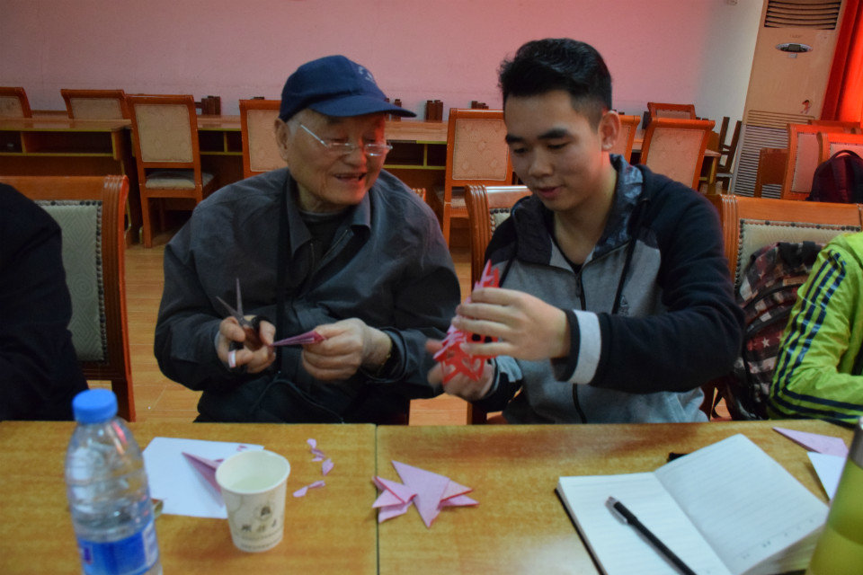 “爱在重阳节,听老党员讲述厚重历史;喜迎十九大,看新时代迈向光明未来。”活动以“重阳沙画”的视频展开,接着,工艺美术协会的成员教授大家六扇剪纸的折法以及剪法,每位同学与老党员们都动手剪出了属于自己的剪纸,老党员还将自己的剪纸加以展示。