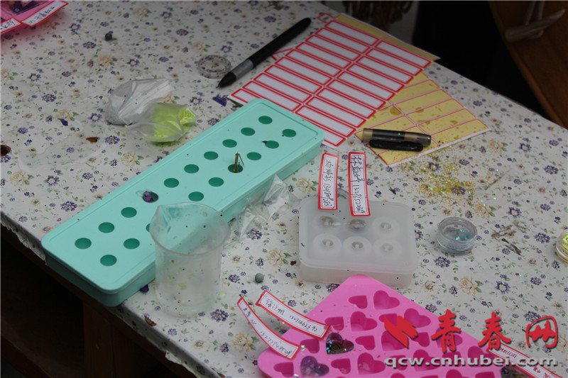 据活动负责人徐玲介绍,树脂胶是提前由工作人员用A、B两种试液按照25:10的比例调好,到场参赛的同学只需要选择自己的模具和放到模具里的东西即可。然后用胶头滴管把树脂胶吸起来,滴到模具里,将要放进去的东西摆弄出自己喜欢的样子,再滴上树脂胶,风干十二小时后即成成品。这些琥珀成品会贴上参赛者标签,由活动方保存。有的同学选择了荧光材料,于是做出的琥珀在夜里发出了淡淡的荧光,这就是晚上的荧光琥珀展的作品。