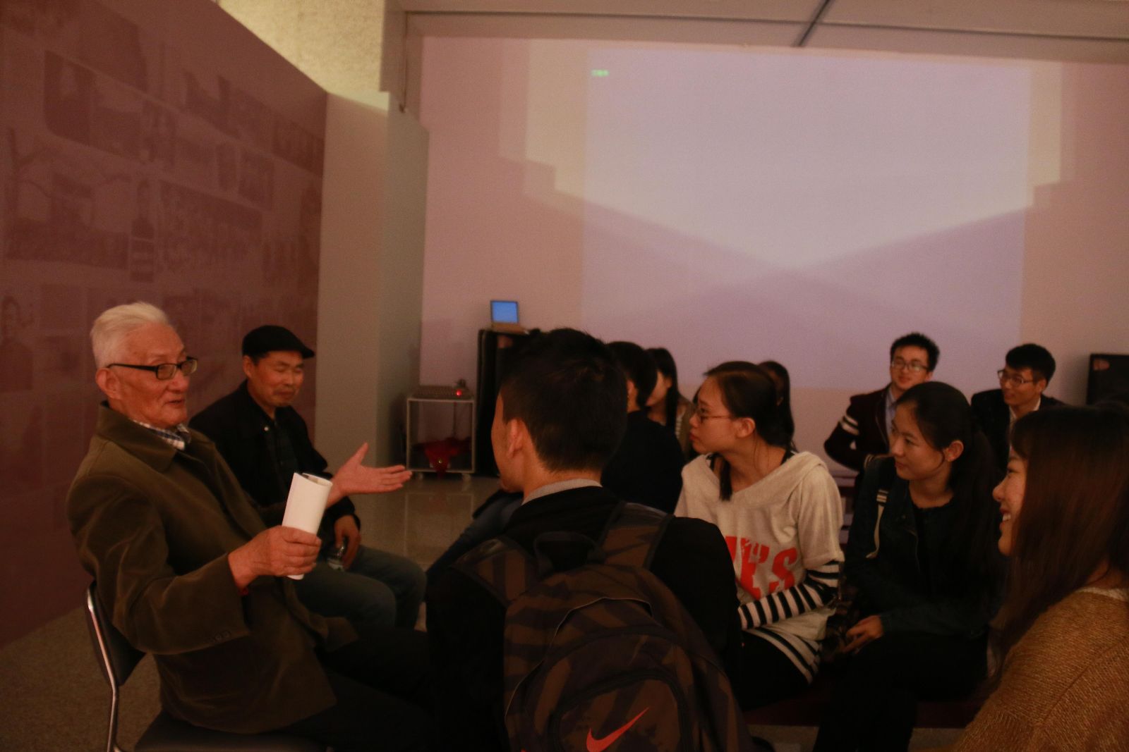 凝视着一张张长征图片,革命老前辈认认真真地为同学们讲解了图片的内容和它们背后的故事。长征历程讲解完毕,同学们意犹未尽,便围坐一团,听老前辈们讲述他们当兵的经历、原子弹制作的艰辛、入党的骄傲、为祖国奉献的无悔等等。他们说年轻的一代人应当传承不怕吃苦的精神,传承红色基因,为中国梦而奋斗。