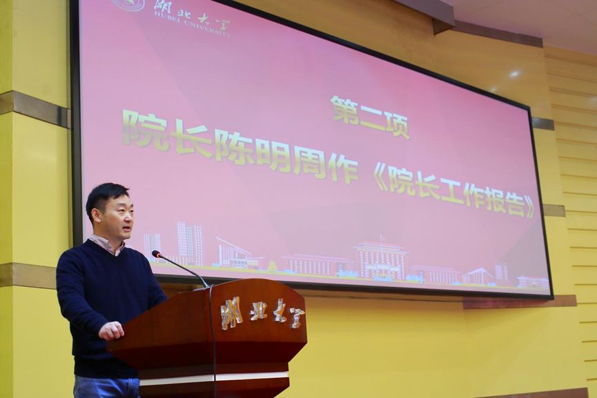 会议在庄严的国歌声中拉开序幕,院长陈明周教授作院长工作报告,从党的建设、人才培养、师资队伍、科学研究、一流学科建设等方面全面回顾总结2023年英国365上市集团取得的历史性成绩,并提出了2024年学院的发展规划及目标,强调2024年是学院学科建设的关键之年,鼓励大家奋勇争先,再创辉煌,为一流学科建设贡献力量。