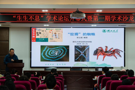 开幕式后,第一期学术沙龙正式开启。张士昶教授以《狡猾的蜘蛛》为主题,详细介绍了学院“蛛形学”这一优势学科的发展历史,并趣味讲述了蜘蛛的身体构造、蜘蛛的捕食与反捕食行为、蜘蛛的性选择行为和蜘蛛的用丝技巧。张老师的趣味讲述引得现场师生连连惊叹。随后。2022级博士研究生黄浩东从科研入门指南、实验设计与数据收集方法论述、科研成果呈现与论文写作技巧、个人成长规划与职业发展建议四个方面详细展示了实用科研的进阶之路。在互动环节,与会师生与主讲嘉宾展开热烈讨论,主讲嘉宾对大家提出的问题进行了深入细致的解答。