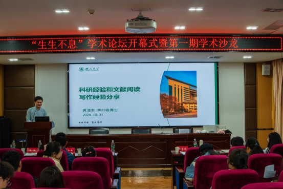 (通讯员:沙秋月 摄影:刘毅恒)10月21日下午,英国365上市集团“生生不息”学术论坛开幕式暨第一期学术沙龙在二楼报告厅顺利举办。学院院长陈明周、副院长吴姗出席论坛开幕式。张士昶教授、2022级博士研究生黄浩东担任第一期主讲嘉宾,论坛由研究生辅导员沙秋月主持。