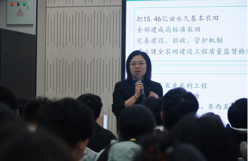 (通讯 陈龙贞 摄影 董龙珊)12月11日上午,在武昌校区一站式学生社区思德厅,校党委常委、副校长张冬卉教授以“阔步迈向农业强国”为题,为学院2025级生物科学类专业新生讲授形势与政策课。