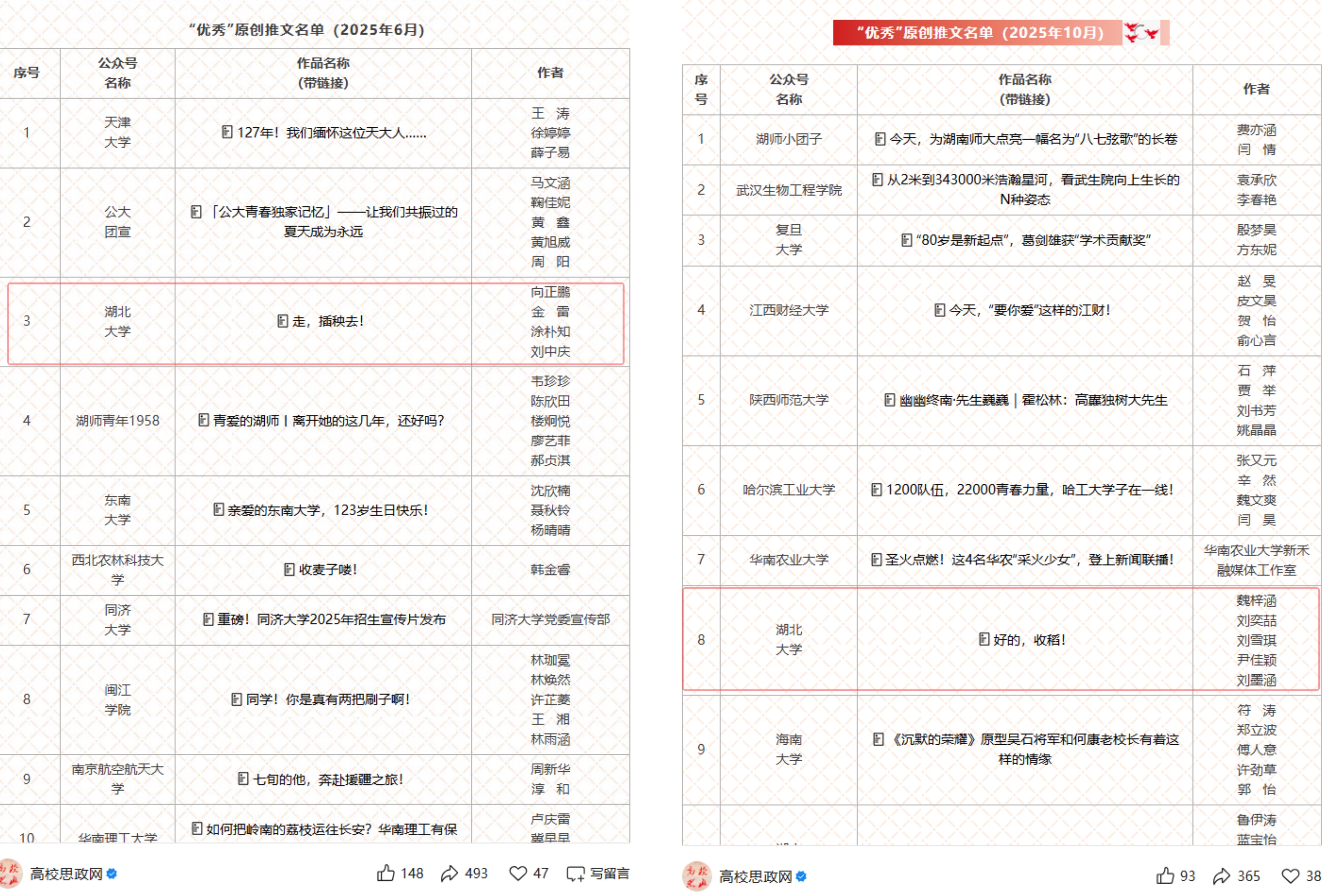在中宣部、教育部、中央网信办、共青团中央四部委高校重点建设思政类公众号评选中,英国365集团官微水稻系列推文分别获评2025年6月和10月“全国高校优秀原创内容”。推文以“稻谷的一生”为主线,展现从实验室到田间地头的完整链条,凸显了劳动教育在培养学生科学精神与家国情怀中的重要作用。