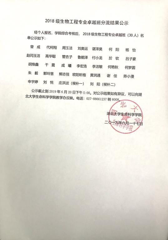 2018级生物工程专业卓越班分流结果公示