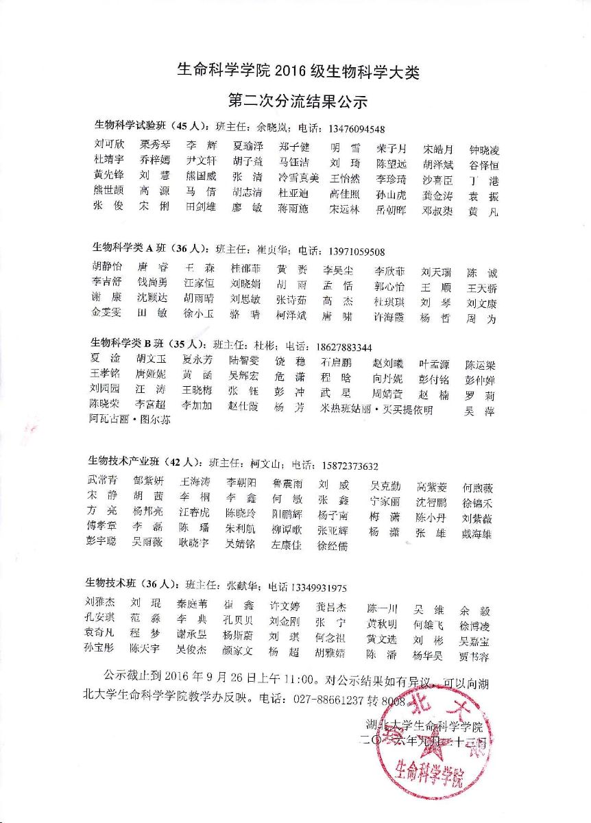 英国365上市集团2016级生物科学大类第二次分流结果公示