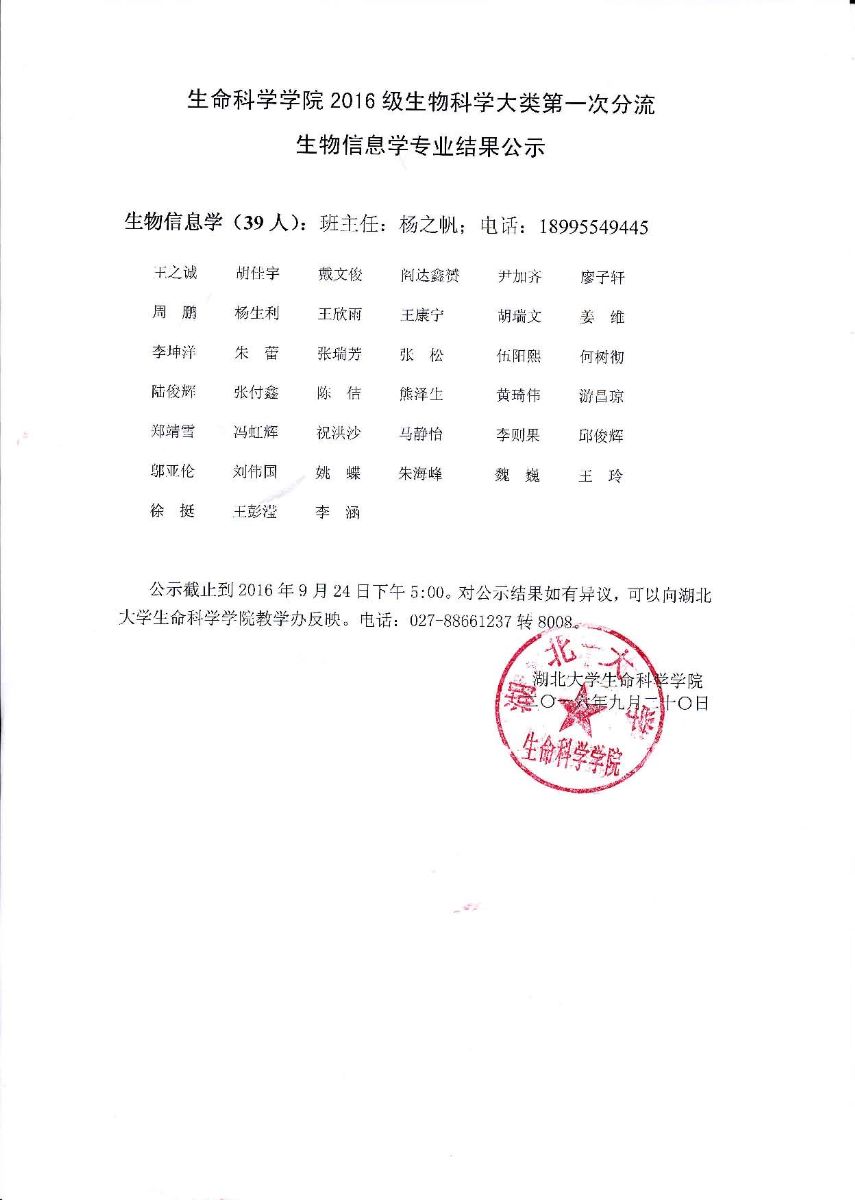 英国365上市集团2016级生物科学大类第一次分流生物信息学专业结果公示