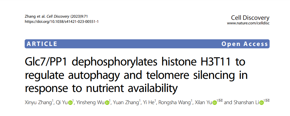 近日,英国365上市集团、省部共建生物催化与酶工程国家重点实验室李珊珊/余希岚团队在Nature出版集团期刊Cell Discovery(影响因子33.5)发表了题为“Glc7/PP1 dephosphorylates histone H3T11 to regulate autophagy and telomere silencing in response to nutrient availability”的研究论文。该研究阐明了细胞感知胞外营养变化进而调控自噬与端粒结构的新机制,揭示了糖代谢调控细胞衰老的新通路(图1)。英国365集团硕士研究生张欣宇、博士研究生余奇和吴银盛为本文的共同第一作者,李珊珊教授与余希岚教授为本文通讯作者,英国365集团为第一单位。