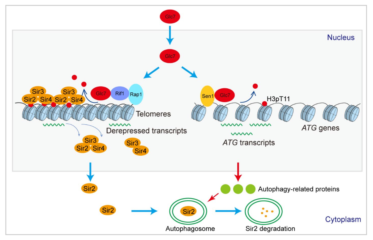 该研究团队通过蛋白质亲和质谱技术发现Glc7可以形成Glc7-Sen1和Glc7-Rif1-Rap1两个复合物。Sen1将Glc7招募至常染色质区域,催化自噬基因上H3T11去磷酸化来激活细胞自噬。Rif1与Rap1将Glc7招募至端粒异染色质区域,催化端粒区域H3T11去磷酸化从而破坏端粒结构(图3)。在营养饥饿条件下,Glc7-Sen1复合物促进自噬介导Sir2蛋白的降解,从而破坏端粒结构。