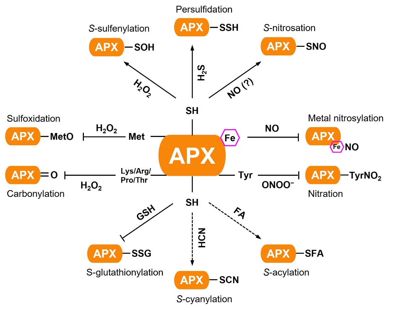 APX是植物细胞中抗坏血酸(ASC-谷胱甘肽(GSH)循环中的重要酶类组分,以ASC为电子供体将H2O2转换为H2O,同时ASC氧化后又可通过循环还原再生(图2)。作为H2O2的主要代谢酶,APX在植物生长发育和响应逆境胁迫中也发挥着重要作用。细胞质APX的活性受到多种氧化翻译后修饰(OxiPTM)调控,包括丝氨酸残基的次磺酸化修饰(-SOH)、硝基化修饰(-SNO)、硫巯基化修饰(-SSH)、谷胱甘肽化修饰(-SSG)、氰基化修饰(-SCN)、和酯酰化修饰(-SFA),甲硫氨酸残基的硫氧化作用以及酪氨酸的硝化等。