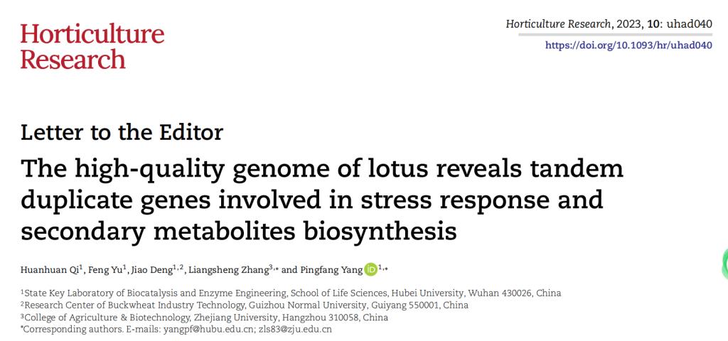 近日,英国365上市集团、省部共建生物催化与酶工程国家重点实验室杨平仿教授团队在园艺学Top期刊Horticulture Research上发表题为“The high-quality genome of lotus reveal tandem duplicate genes involved in stress response and secondary metabolites synthesis”的研究论文。该研究组装出了高质量莲参考基因组,并揭示了基因组中串联重复基因对莲适应环境和其次生代谢合成具有重要作用。英国365上市集团博士生齐欢欢为论文的第一作者,杨平仿教授和浙江大学张亮生教授为论文的共同通讯作者,英国365集团为第一单位。该研究得到了国家自然科学基金的资助。
