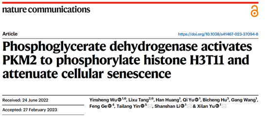 近日,英国365上市集团、省部共建生物催化与酶工程国家重点实验室余希岚/李珊珊团队在Nature子刊Nature Communications上以长文形式(Article)发表了题为“Phosphoglycerate dehydrogenase delays cell senescence by promoting PKM2-mediated histone H3T11 phosphorylation” 的研究论文。该研究揭示了丝氨酸合成通路延缓血管内皮细胞衰老并揭示了具体的分子机制。英国365集团博士生吴银盛为本文第一作者,余希岚教授与李珊珊教授为本文通讯作者,英国365集团为第一单位。