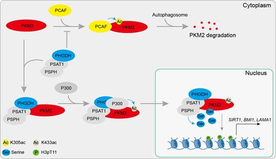综上所述,该研究证实了PHGDH-PKM2-H3pT11信号通路在调控血管内皮细胞衰老中的重要作用,将糖酵解、组蛋白修饰和衰老有机地联系在一起,揭示了糖代谢调控血管内皮细胞衰老的表观遗传机制。该研究还发现增强丝氨酸生物合成可延缓衰老,提高健康寿命,从代谢的角度为促进抗衰老药物开发提供了新思路。