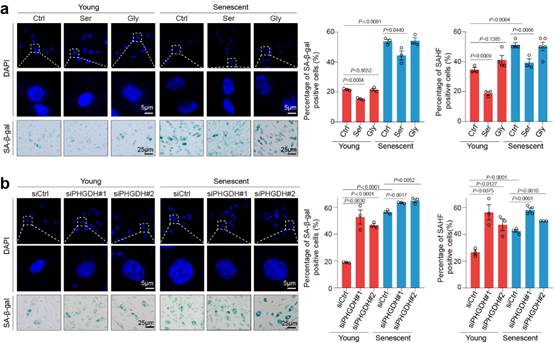 在本项研究中,研究人员通过高通量测序发现在衰老过程中,糖酵解衍生的丝氨酸代谢酶在血管内皮细胞的衰老过程中显著下调,特别是关键限速酶磷酸甘油酸脱氢酶PHGDH。衰老过程中丝氨酸的含量也显著下降。敲低PHGDH的表达加速细胞的衰老,而过表达PHGDH或者添加丝氨酸则会延缓细胞衰老(图2)。这些结果说明丝氨酸代谢对于延缓细胞衰老很重要。