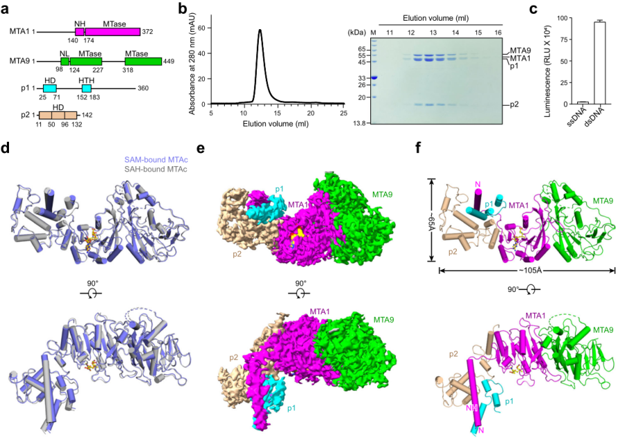 DNA和RNA的甲基化在调节生物体的各种生物过程中起着关键作用。除了DNA C5-胞嘧啶甲基化(5mC)和RNA N6-腺苷甲基化(m6A),在原核生物和真核生物中发现的另一种普遍的甲基化类型是N6-甲基脱氧腺嘌呤(6mA)。纤毛状嗜热四膜虫中鉴定的MTA1复合物是第一个经实验验证的真核生物6mA甲基转移酶(MTases)复合物,由MTA1、MTA9、p1和p2四个亚基组成(图1)。然而MTA1四元复合物的整体结构和工作机制尚不清楚,对整个MTA1复合物的结构研究将有助于阐明这四个亚基的工作模式,更好地理解真核生物的6mA MTase。