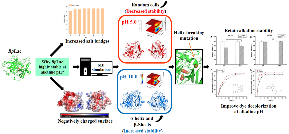 木质素降解酶因其独特的非特异性氧化还原催化机制,是环境微生物具备解聚木质素大分子能力的关键。漆酶作为典型的木质素降解酶之一,不仅在生物质降解中发挥作用,并且广泛应用于异生物质降解、生物催化、生物传感器及生物漂白等工业领域。课题组前期应用漆酶对生物质进行预处理,实现了对纤维素的水解增效。针对印染废水、制革废水的强碱性对漆酶生物修复性能的抑制,本研究旨在通过明晰环境因素对漆酶蛋白构效关系影响的分子机制,改善碱性废水的污染物去除效率。基于前期工作得到具有碱耐受性的短小芽孢杆菌漆酶,论文发现,碱性环境下漆酶蛋白盐桥数的增加以及表面静电势呈负电荷有利于该细菌漆酶维持碱耐受性。随后利用分子动力学模拟分析pH 5和pH 10环境下漆酶蛋白构象的差异。鉴定出5个在不同pH下波动较大的氨基酸残基,其中Pro359与Thr414之间的距离在pH值为10.0时较为稳定,进一步构成细菌漆酶碱耐受性的成因之一。通过DSSP、PCA、FEL等分析发现,漆酶在碱性环境下倾向形成更多的刚性α-螺旋和β-折叠,而酸性环境下则形成较多的无规则卷曲,表明更多刚性构象的形成有利于漆酶在碱性环境下维持蛋白的稳定。对于T1活性中心附近的α-螺旋进行定点突变,破坏该刚性结构,突变后的漆酶蛋白催化活性得到提高,而碱耐受性并未受影响。突变型漆酶在碱性环境下对不同合成染料的降解效率较野生型漆酶大幅提高(图2)。
