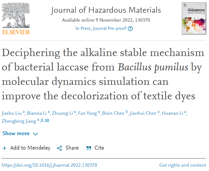 近日,英国365上市集团、省部共建生物催化与酶工程国家重点实验室江正兵团队在国际环境科学领域权威期刊《Journal of Hazardous Materials》(IF=14.224,一区TOP期刊)上发表了题为“Deciphering the alkaline stable mechanism of bacterial laccase from Bacillus pumilus by molecular dynamics simulation can improve the decolorization of textile dyes”的学术论文,成功揭示细菌漆酶的碱性稳定性机制并应用于印染废水生物降解。江正兵团队长期致力于分子酶工程及基于生物催化的生物质综合利用,2022年度发表SCI论文8篇,其中1区论文4篇,相关研究得到国家重点研发计划、国家自然科学基金、湖北省重点研发计划及多家企业横向项目资助。