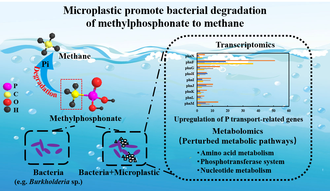 通常直径小于5 mm的塑料被认为是微塑料,由于海水中的微塑料污染物的持久性和对生物体的潜在不利影响,微塑料污染已成为一个全球公共卫生问题。微塑料可以影响海洋微生物的生长和代谢,进而影响微生物的环境功能。海洋细菌大多数具有合成甲基膦酸的能力,由于甲基膦酸分解后会释放出甲烷被认为是“甲烷悖论”的起源。在沿海地区的表层含氧海水中,溶解的甲烷浓度通常是过饱和的,相对于大气中甲烷饱和度在105-175%之间,这种现象被称为“甲烷悖论”。而微塑料对具有分解甲基膦酸释放甲烷能力的功能性微生物的分子作用机制报道甚少。