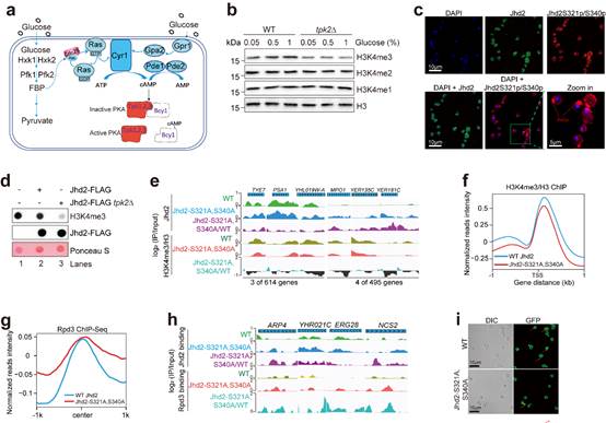 在这项研究中,李珊珊/余希岚团队通过筛选、质谱以及生化技术发现葡萄糖通过激活PKA蛋白激酶家族的催化亚基Tpk2来抑制组蛋白去甲基转移酶Jhd2的酶活性,促进细胞里的组蛋白H3K4三甲基化(H3K4me3),进而调控细胞自噬和衰老。机制上,细胞通过糖代谢产物激活PKA家族催化亚基Tpk2,激活的Tpk2可催化组蛋白去甲基化酶Jhd2的磷酸化。由于Tpk2催化的Jhd2磷酸化位点位于Jhd2的核定位信号序列上,Tpk2催化的Jhd2磷酸化可抑制Jhd2的细胞核定位。Tpk2催化的Jhd2磷酸化还阻止Jhd2结合到染色体上,从而抑制其酶活性。此外,Tpk2催化的Jhd2磷酸化还促进Jhd2被泛素-蛋白酶体降解,进一步提高细胞里的组蛋白H3K4me3。生物信息学分析发现Tpk2催化的Jhd2磷酸化在调控细胞自噬与细胞寿命中起重要作用。在低浓度葡萄糖条件下,Jhd2结合在染色体上抑制自噬基因转录;随着葡萄糖浓度的增加,Tpk2磷酸化Jhd2的活性增强,导致Jhd2被泛素化降解,从而维持细胞的基础自噬水平以及正常的时序性寿命。