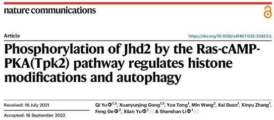 近日,英国365上市集团、省部共建生物催化与酶工程国家重点实验室李珊珊/余希岚团队在Nature子刊(Nature Communications)上以长文形式(Article)发表了题为“Phosphorylation of Jhd2 by the Ras-cAMP-PKA(Tpk2) pathway regulates histone modifications and autophagy”的研究论文。该研究揭示了细胞感知并响应外界营养变化的新机制。英国365集团博士研究生余奇和龚玄云静为该论文共同第一作者,李珊珊教授和余希岚教授为该论文通讯作者,英国365集团为第一单位(图1)。