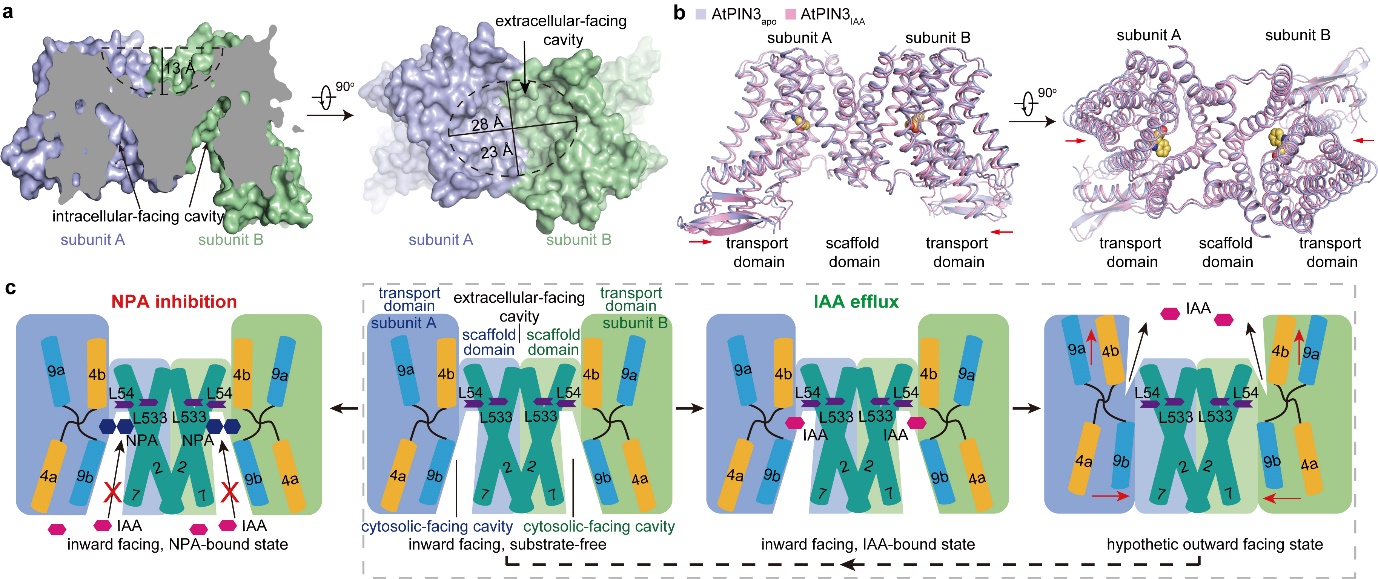 图2. AtPIN3转运生长素分子机制。 a. AtPIN3二聚化界面展示。b. AtPIN3apo和AtPIN3IAA结构比较。c. AtPIN3转运生长素IAA和NPA抑制AtPIN3活性的分子机制模型。