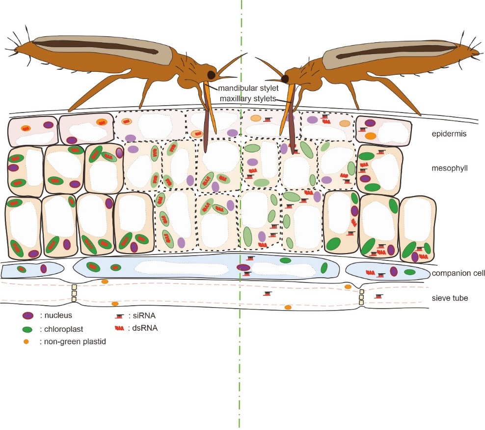 进一步,该研究还比较了质体表达不同构象dsRNA的差异,发现表达发卡RNA(hpRNA)的质体转基因植物中可能会发生非交互性重组和微同源介导的DNA删除,而表达dsRNA的质体基因组则更稳定。因此,该研究首次证明了质体介导RNAi在防控一些非咀嚼式口器害虫中的应用潜力,并发现了其抗虫效率与靶标害虫的取食方式有关(图2)。