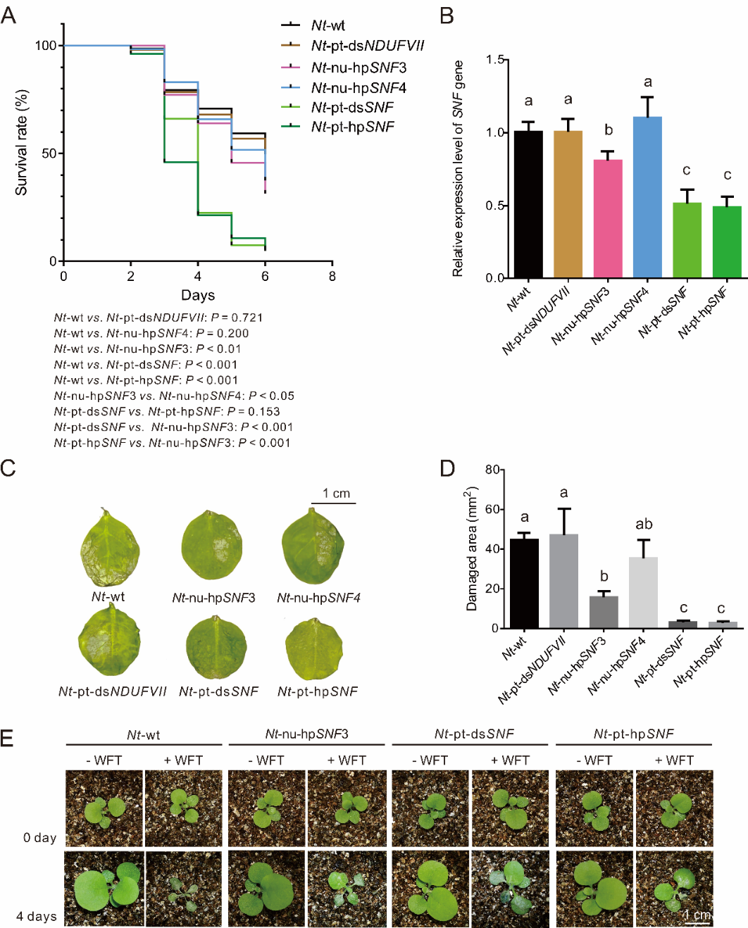 图1. 质体转基因策略相比核转基因策略对西花蓟马有更好的防控效果