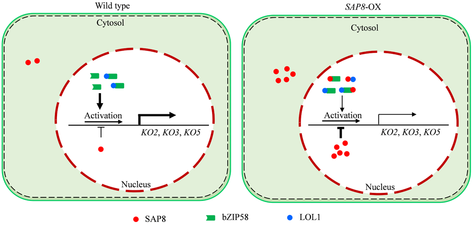 赤霉素是一种调控植物生长发育的重要激素。自上个世纪“绿色革命”以来,赤霉素的合成及信号转导基因的分子本质逐渐被揭示。在赤霉素的生物合成过程中,众多代谢酶类和转录因子的协同发挥作用。杨平仿教授团队2020年在PLOS Genetics发表文章证实水稻中OsKO1基因参与赤霉素合成(前人研究认为在水稻OsKO1- OsKO5家族成员中,仅有OsKO2参与赤霉素合成),同时,该团队发现逆境相关蛋白OsSAP8参与赤霉素合成调控,但具体机制有待揭示。杨平仿教授团队进一步通过OsSAP8基因敲除突变体和过表达突变体表型,结合内源赤霉素含量和外源赤霉素恢复等实验数据证实OsSAP8负调控水稻赤霉素合成。通过酵母单杂交和凝胶阻滞实验证实OsSAP8可以结合在OsKO2, OsKO3, OsKO5基因启动子区域的ACGTGTC顺式作用元件上。研究进一步发现,OsSAP8可以减弱OsLOL1和OsbZIP58 对OsKO2基因的转录激活活性,从而发挥负调控赤霉素合成的作用(图2)。