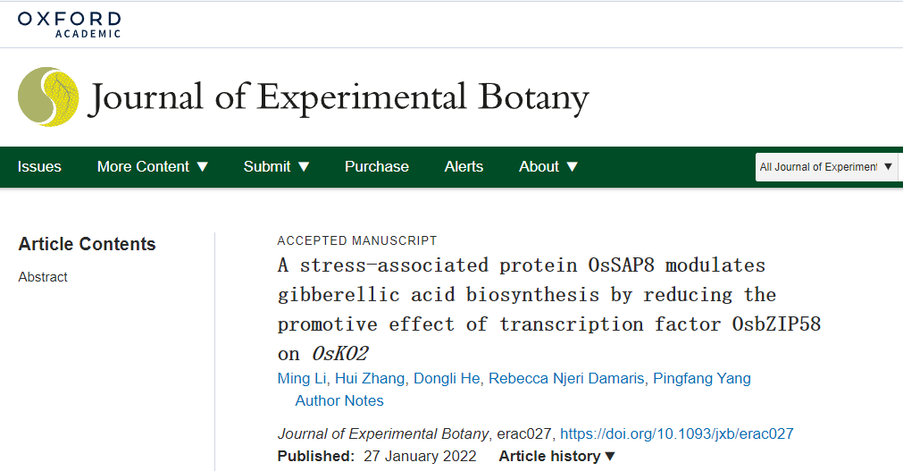 近日,英国365上市集团杨平仿教授团队在水稻赤霉素合成调控途径研究中取得重要进展。相关研究成果以“A stress-associated protein OsSAP8 modulates gibberellic acid biosynthesis by reducing the promotive effect of transcription factor OsbZIP58 on OsKO2(《逆境相关蛋白OsSAP8通过减弱OsbZIP58转录因子对OsKO2基因的转录激活调节水稻赤霉素合成》)”为题,在线发表于国际植物学重要期刊Journal of Experimental Botany上。英国365上市集团副教授李明和华中农业大学植物科学学院博士后张慧为该论文共同一作,杨平仿教授为通讯作者,英国365集团为第一单位(图1)。