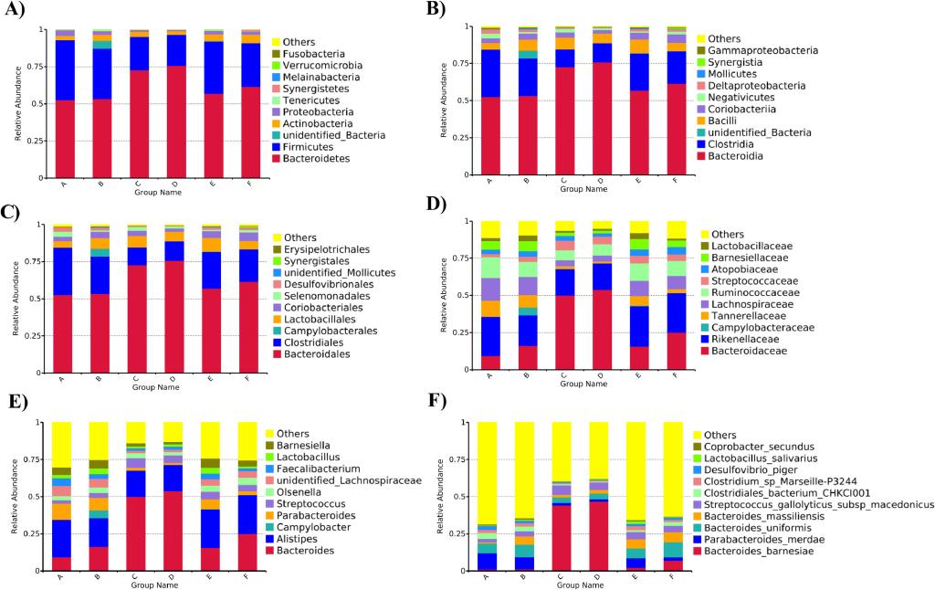 该团队基于近年来在该研究领域的持续积累,依托药物高通量筛选国家地方联合工程中心和中药生物技术省重点实验室的科研平台开展了该方向的深入研究,充分挖掘传统中医药瑰宝,优选具有抗炎、抗感染、提高机体免疫功能的中药与分离筛选得到的性能优良益生菌进行科学配伍,利用现代发酵工程技术研制获得新型中药益生菌复合微生态制剂。在肉鸡饲料中添加该制剂、金霉素(抗生素对照)、市售中药微生态制剂、单一中药、单一益生菌,相比其他各组,中药益生菌复合微生态制剂组肉鸡的生长性能显著提高,免疫器官(法氏囊和脾脏)更为成熟,血清和回肠粘膜分泌型IgA和血清IgG水平、血清白蛋白和总胆固醇等生化指标、谷胱甘肽过氧化物酶和丙二醛等氧化反应指标及肠道形态均得到明显改善,并且空肠紧密连接蛋白Occludin和ZO-1的mRNA表达水平也显著提高,这提示肉鸡肠道屏障功能明显增强。更进一步,该课题组还发现中药益生菌复合微生态制剂组的肉鸡肠道微生物群多样性增加(图1),特别是有益菌Olsenella、乳酸杆菌及Barnesiella的相对丰度得到显著提高(图2)