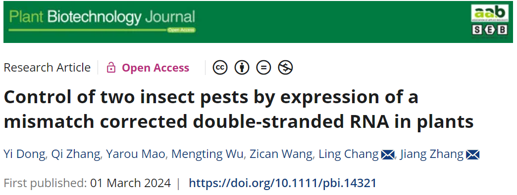近日,Plant Biotechnology Journal在线发表了张江教授团队题为“Control of two insect pests by expression of a mismatch corrected double-stranded RNA in plants”的研究论文(图1)。该研究通过对dsRNA的重头设计,成功使得表达一种dsRNA的转基因植物能够同时抵抗桃蚜和烟粉虱这两种重大农业害虫,扩大了植物介导RNAi的抗虫谱。