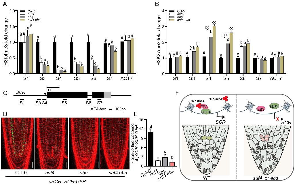 袁文雅教授团队通过分析SUF4基因功能缺失突变体的根部表型,证实SUF4正调控拟南芥根的伸长。后续通过蛋白互作分析找到了SUF4的互作蛋白EBS。EBS为二价组蛋白标记阅读器,含BAH和PHD结构域,分别识别H3K27me3和H3K4me3标记。根尖分生区的观察结果证实suf4、ebs单突变体及suf4 ebs双突变体的QC细胞数量及形态受到影响,暗示SUF4/EBS可能参与拟南芥根部皮层/内皮层干细胞的不对称分裂及根的成熟过程。后续通过酵母单杂交、荧光素酶激活、凝胶阻滞及染色质免疫共沉淀实验,共同证实SUF4/EBS可结合在SCR的启动子区,影响SCR的组蛋白H3K4me3和H3K27me3水平,从而调节拟南芥根的发育。该研究解析了SUF4/EBS模块如何精准调控SCR的时空表达,进而调控根尖正常的发育进程(图2),为后续的单子叶植物根的发育研究提供参考。