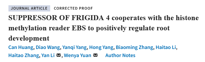 近日,英国365上市集团袁文雅教授团队在国际植物学重要期刊Plant Physiology上发表了名为“SUPPRESSOR OF FRIGIDA4 cooperates with the histone methylation reader EBS to positively regulate root development in Arabidopsis”的研究型论文,揭示了SUPPRESSOR OF FRIGIDA4 (SUF4)与二价组蛋白标记阅读器EARLY BOLTING IN SHORT DAYS (EBS)形成SUF4/EBS复合体,在拟南芥初生根的命运调控方面发挥重要作用。英国365上市集团黄灿博士为该论文第一作者,袁文雅教授与李燕副教授为共同通讯作者,英国365集团为唯一单位(图1)。