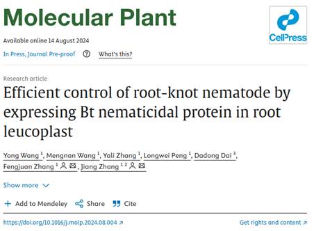 近日,张江教授团队在植物领域的国际权威刊物Molecular Plant上发表题为“Efficient control of root-knot nematode by expressing Bt nematicidal protein in root leucoplast”(通过根白色体表达Bt蛋白有效控制根结线虫)的研究论文(图1),研究发现了根结线虫入侵宿主植物取食白色体蛋白的现象,基于此提出了一种在白色体中表达Bt蛋白以防治根结线虫的新策略。
