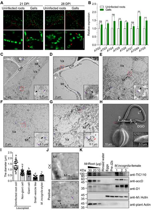正常情况下,未侵染根结线虫的根部白色体通常呈现规则的形状,直径约在2 μm。然而,我们发现在线虫入侵后,根结内的白色体发生了降解现象,其GFP荧光信号可以在白色体外观察到。此外,破裂降解的白色体周围还形成了小囊泡(图3A)。与未侵染的根相比,我们检测到根结内自噬相关基因的表达显著上调。通过免疫电镜进一步观察,发现白色体的降解仅发生在巨细胞内,并在白色体周围形成了装载有GFP蛋白的小囊泡(图3F-G)。为了探究根结线虫是否能够取食这些在响应过程中发生变化的白色体,我们分离了根结线虫的取食器官—口针和食道腺,并对这些结构的直径进行了比较。结果表明,只有直径小于根结线虫口针的小囊泡具备被根结线虫取食的可能性(图3H-I)。随后,通过免疫电镜和Western blot分析,我们进一步证实了白色体的内源蛋白和外源表达的GFP均可在根结线虫体内检测到(图3J-K)。