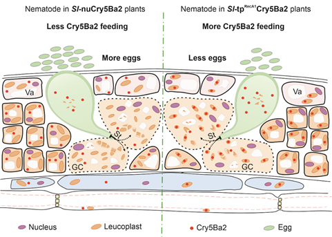 根结线虫是一类能寄生在多种作物根部的地下病害,在全球范围内流行,难以防治,可导致严重的经济损失。苏云金芽孢杆菌产生的Bt蛋白以及转Bt基因作物已成功的用于多种病虫害的防治策略中,其中也有研究报道了Bt蛋白对根结线虫的有效性。质体是植物重要细胞器,包括叶片中的叶绿体和根部的白色体(leucoplast)等,在光合作用、植物代谢产物合成以及生物与非生物胁迫响应中发挥着至关重要的作用。前期研究表明,根结线虫入侵后,在根结(gall)内会诱导几个植物细胞分化而不分裂,从而形成巨细胞(giant cell),供其吸取寄主植物的营养物质。虽然已有部分研究报道了巨细胞内细胞器的显著增多,但其具体的生物学意义尚不明晰。