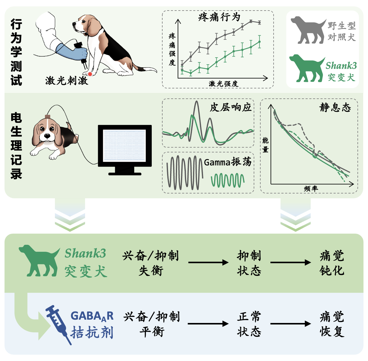 携带SHANK3(编码突触后脚手架蛋白基因)突变的孤独症人群表现为对疼痛的敏感性降低。然而,疼痛处理受损背后的神经机制仍不清楚。家犬在长期的家养训话过程中形成了独特的与人亲密有效社会互动的行为;同时,家犬的疼痛感知通路与人类相似,因此有望成为研究包括孤独症在内的精神疾病中痛觉加工异常的理想模型。