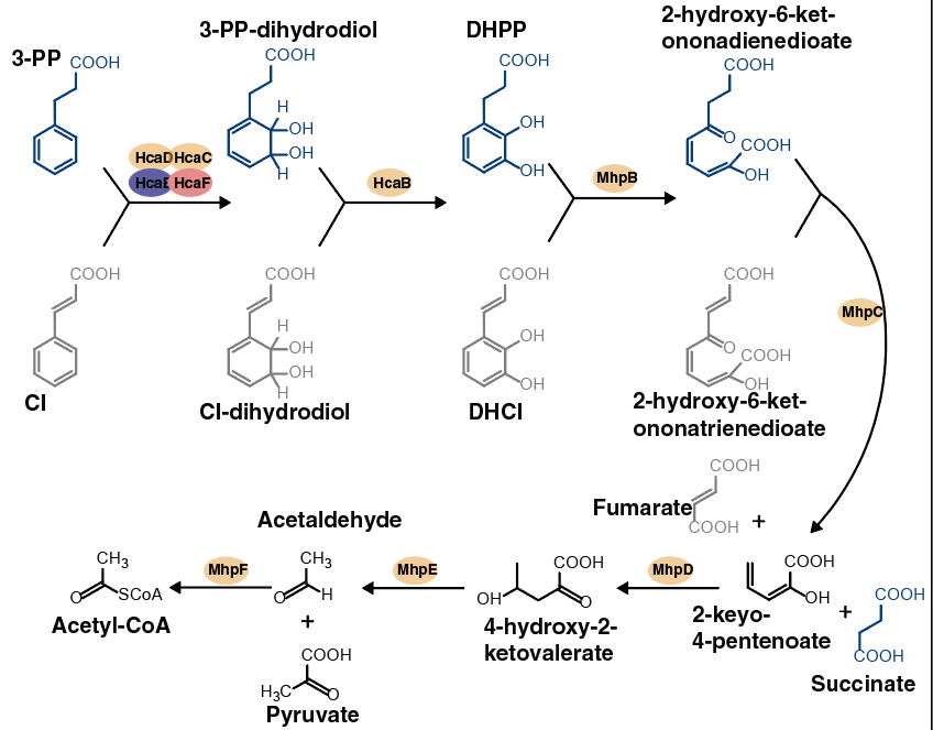 芳香族化合物因其化学稳定性,在环境中难以自然降解,长期存在并对生态系统和人类健康构成威胁。生物降解作为一种有效的环境修复方法,通过微生物及其酶的作用将这些污染物分解为无害物质。其中,Rieske型芳香双加氧酶(RDOs)和外切双加氧酶(EDOs)在这一过程中发挥着关键作用。在大肠杆菌中,存在一条3-苯丙酸(3-PP)和肉桂酸(CI)的代谢降解途径,这其中RDOs和EDOs等酶扮演了关键的作用。