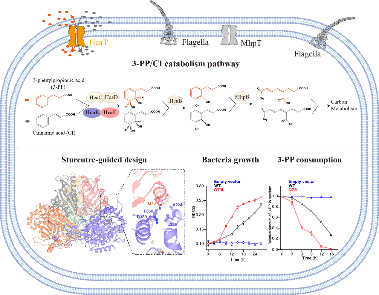 课题组首先聚焦于Rieske型芳香双加氧酶(RDOs),这类酶在微生物降解芳香烃类化合物中发挥关键作用。然而,由于其稳定性差、底物特异性有限以及生物降解速率低等问题,限制了其在工业和环境修复中的应用。研究团队通过冷冻电镜(cryo-EM)技术解析了3-苯丙酸(3-PP)和肉桂酸(CI)代谢降解的途径中的Rieske型芳香双加氧酶HcaEF的高分辨率六聚体结构,揭示了其在无底物和底物结合状态下的结构特征。基于结构信息,设计了用于提高HcaEF异源六聚体稳定性的Q73I突变体,显著提升了HcaEF酶的热稳定性和催化效率(提高~50%)。这种结构引导的设计突变稳定异源六聚体的稳定性的酶工程策略为其他Rieske型芳香双加氧酶的改造提供了新的思路,在其他芳香污染物的生物降解中具有广泛的应用前景。进一步,团队将Q73I突变体整合到大肠杆菌K-12中,显著提升了菌株对3-苯丙酸(3-PP)的降解能力。这一成果不仅证明了工程化酶在微生物代谢中的有效性,还为利用微生物降解环境污染物提供了新的策略。这种工程菌株的开发为环境生物修复和工业生物催化提供了新的工具,有望加速污染物的降解过程,降低生物修复的成本。研究成果以《Structure-guided engineering of a Rieske-type aromatic dioxygenase for enhanced consumption of 3-phenylpropionic acid inEscherichia coli》为题发表在《Journal of Hazardous Materials》杂志。英国365上市集团邢琼教授为本文通讯作者,青年教师蒋文学、研究生吴淼以及中国科学院精密测量科学与技术创新研究院龚洲副研究员为共同第一作者。