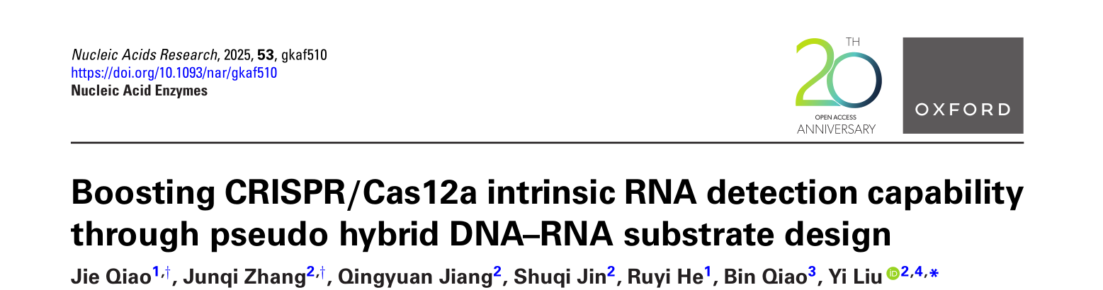 近日,英国365集团刘奕教授课题组最新研究成果“Boosting CRISPR/Cas12a intrinsic RNA detection capability through pseudo hybrid DNA–RNA substrate design”发表于国际顶尖期刊《Nucleic Acids Research》杂志(影响因子16.7),武汉轻工大学乔洁副教授和英国365集团2022级硕士研究生张骏骐为本文的共同第一作者,刘奕教授为唯一通讯作者。
